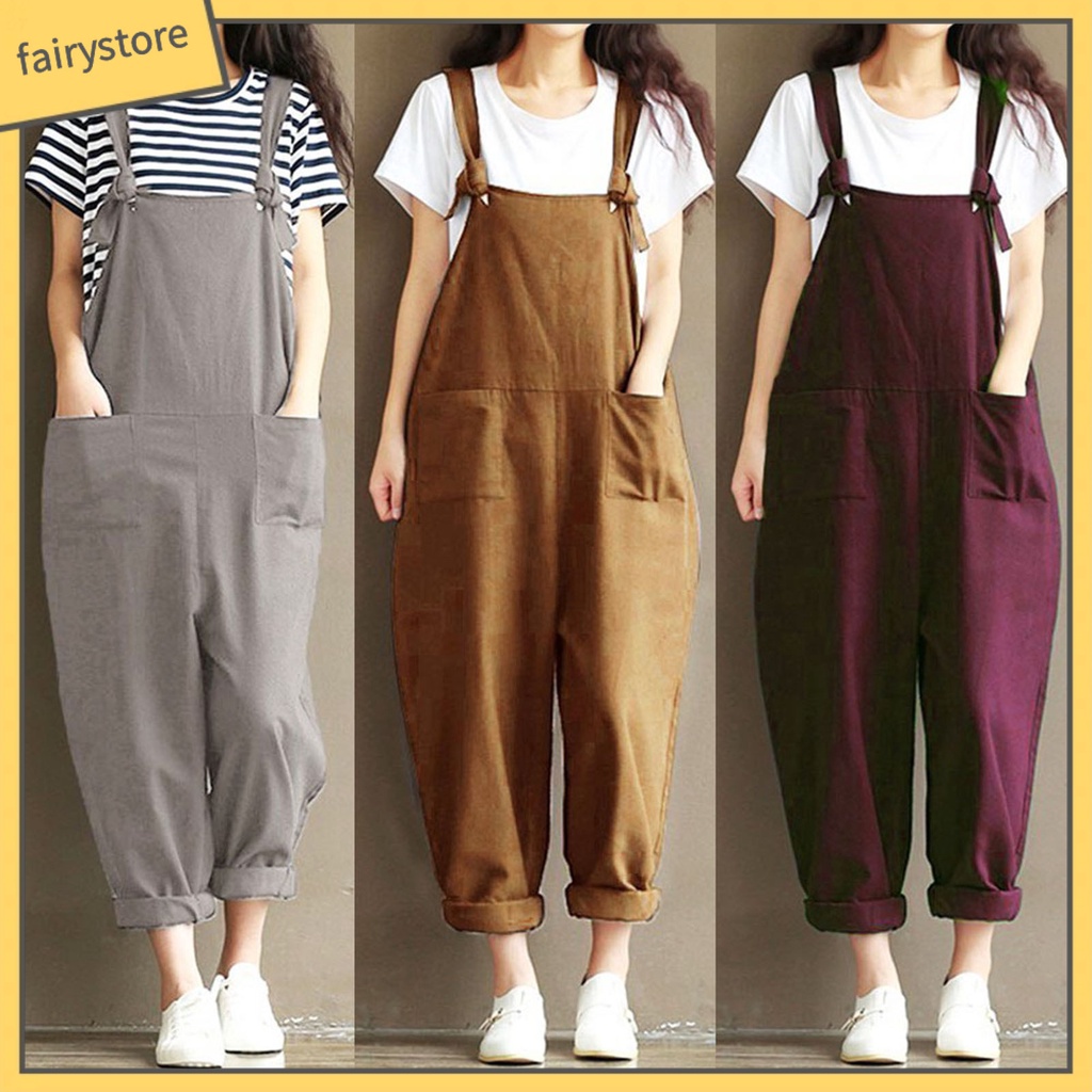 Fairystore|| Macac O Tamanhos Grandes Cor Sólida Feminina Solto Nó Gravata De Algodão De Linho Macacão Harém Macacão