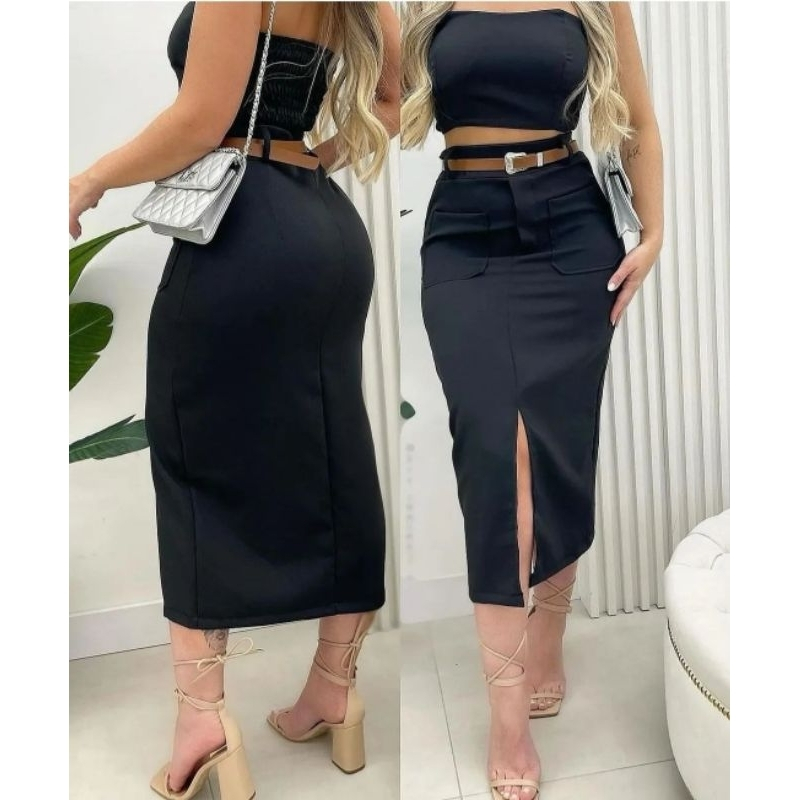 Saia Midi Alfaiataria Com Cinto Bolso Frontal Moda evangélica festa