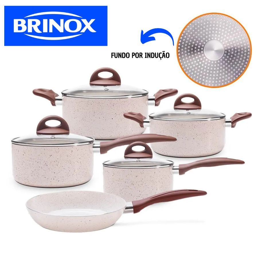 Conjunto de Panelas 5 Peças Brinox Ceramic Life Optima 4,5 mm de Espessura com Antiaderente Cerâmico, Fundo de Indução e Tampas de Vidro – Stone