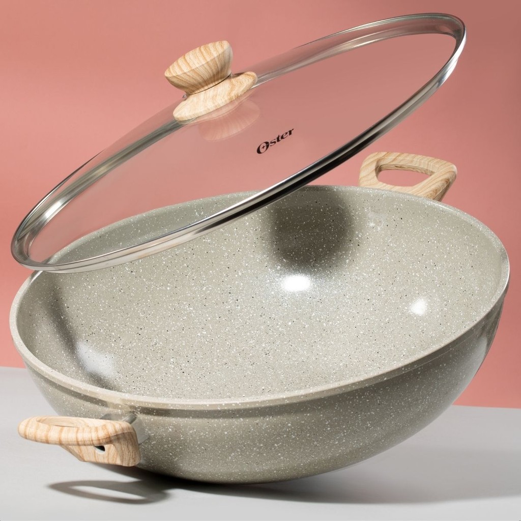 Panela Wok Grande Antiaderente Fundo Indução Com Tampa 7L 34Cm Marble Edition Oster Revestimento Duplo de Cerâmica