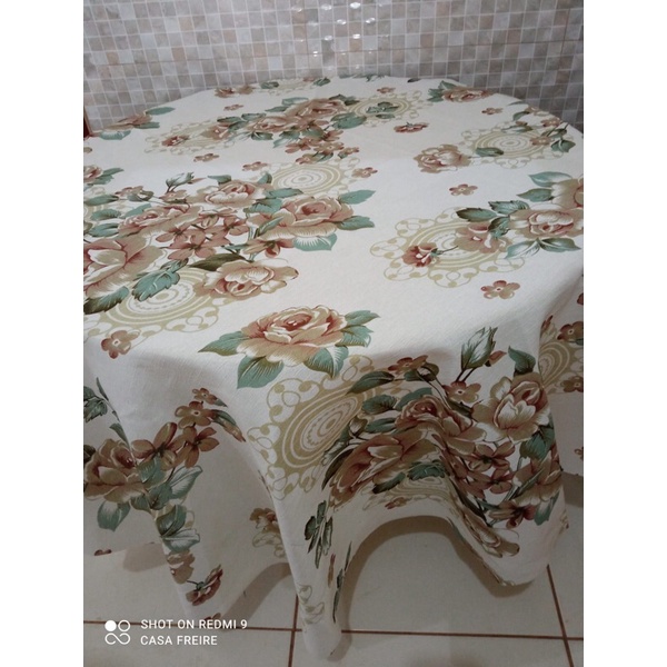 Toalha de mesa redonda 6 lugares no tecido linhão rústico flor verde
