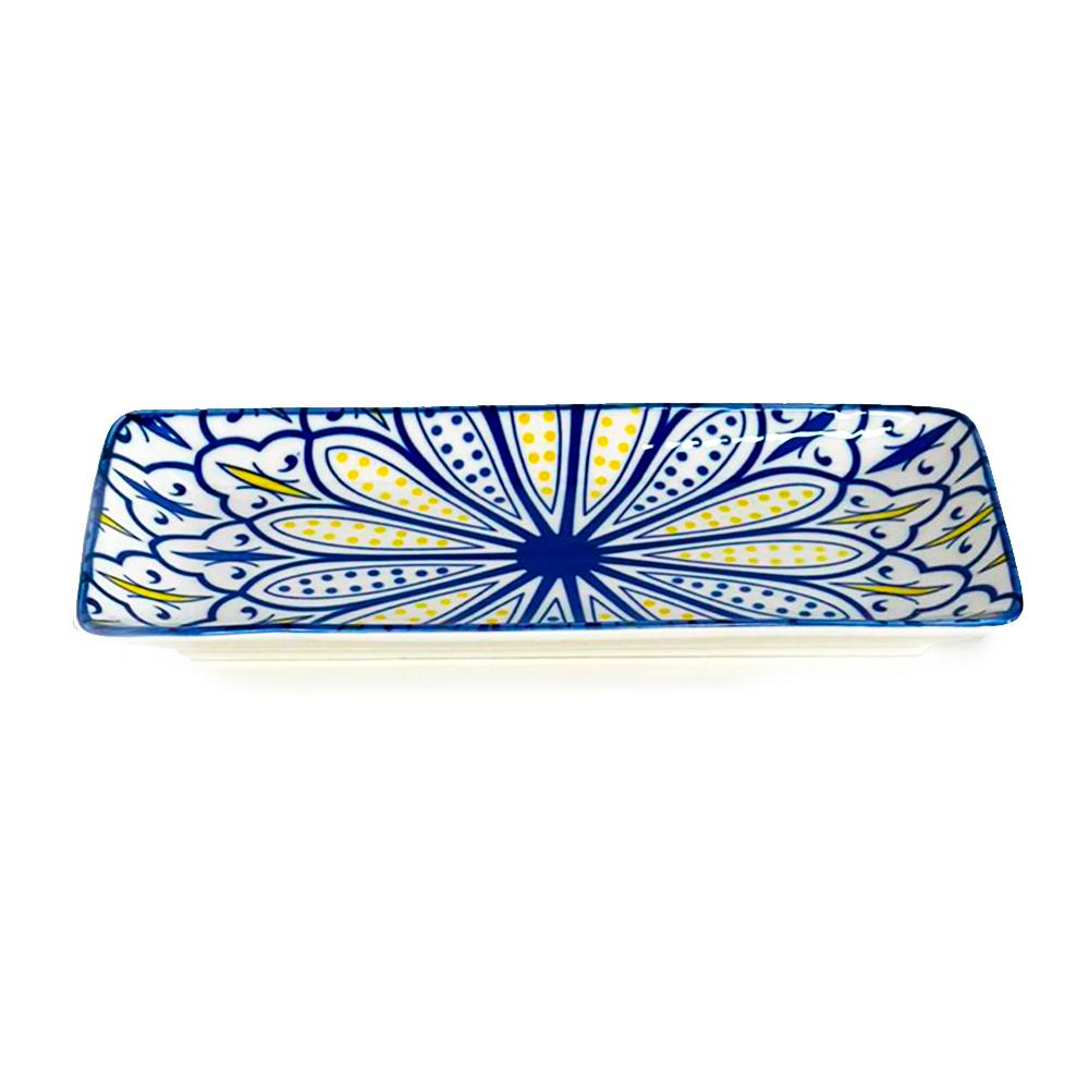 Travessa Retangular em Cerâmica Estampada Mandala Azul e Amarela 25cm