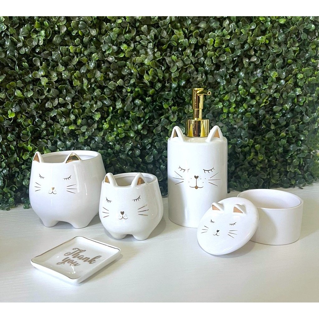Dispenser Porta Sabonete Liquido 17x11CM Lavabo Saboneteira Gatinho Branco Detalhes em Dourado