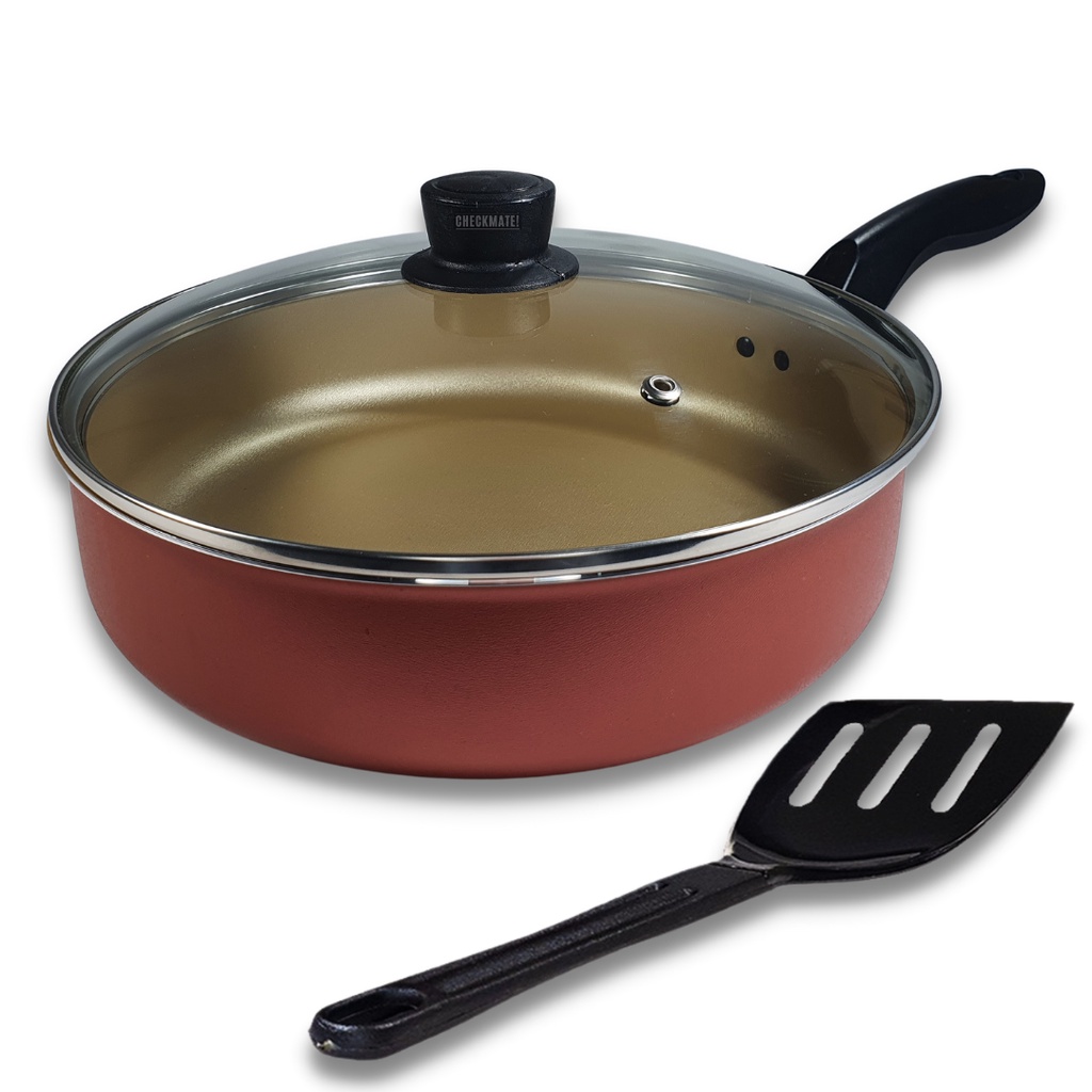 Frigideira Alta 18 Cm Com Tampa De Vidro E Espátula Antiaderente Com 5 Camadas De Teflon Cor Cereja Gold Frigideira Grande Funda Alumínio Resistente