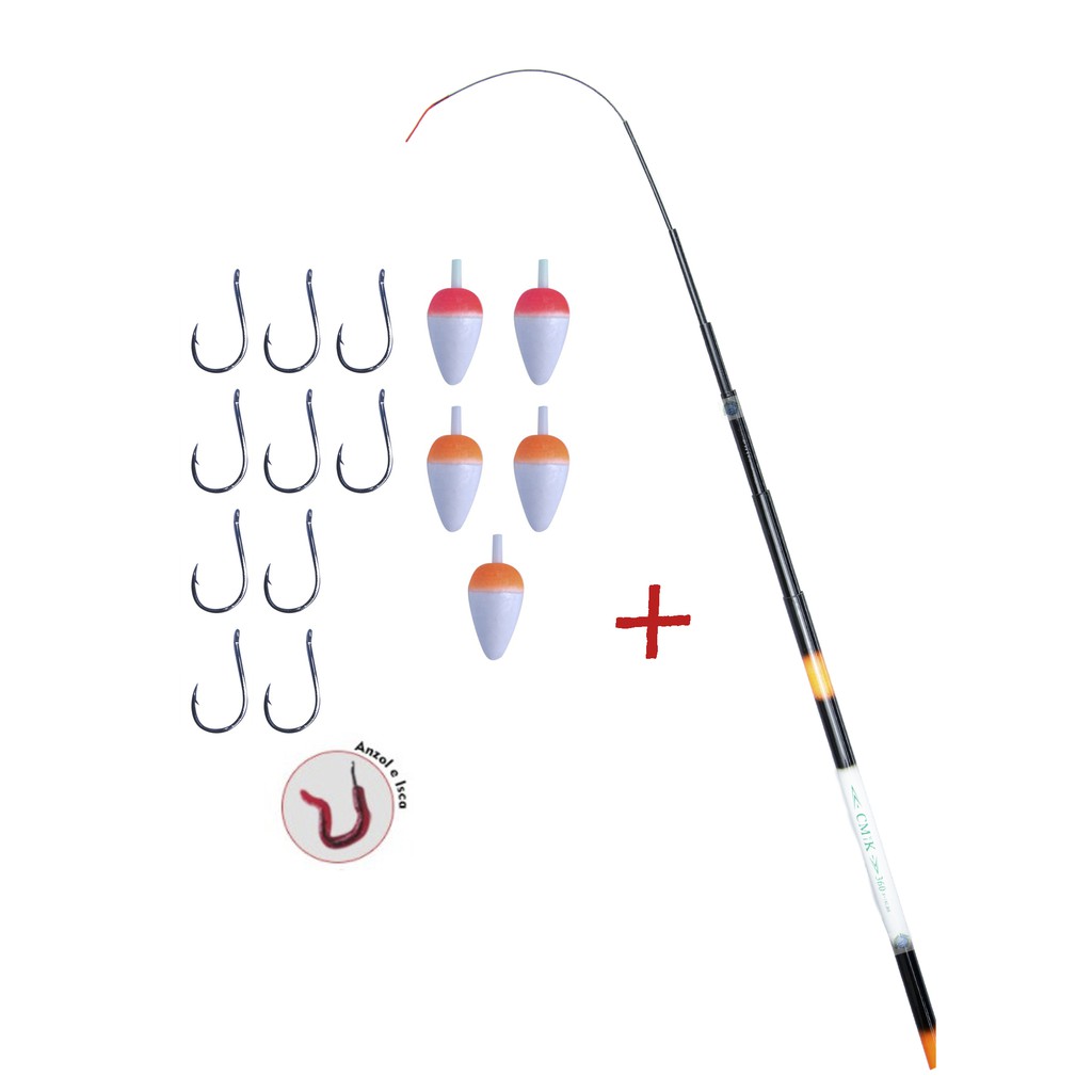 Vara Telescópica 3,60M Fibra de Vidro Mais 5 Boias Mais 10 Anzóis 5 Iscas minhoca Kit Pescaria Tilápia Lambari Piau entre outros Pesca
