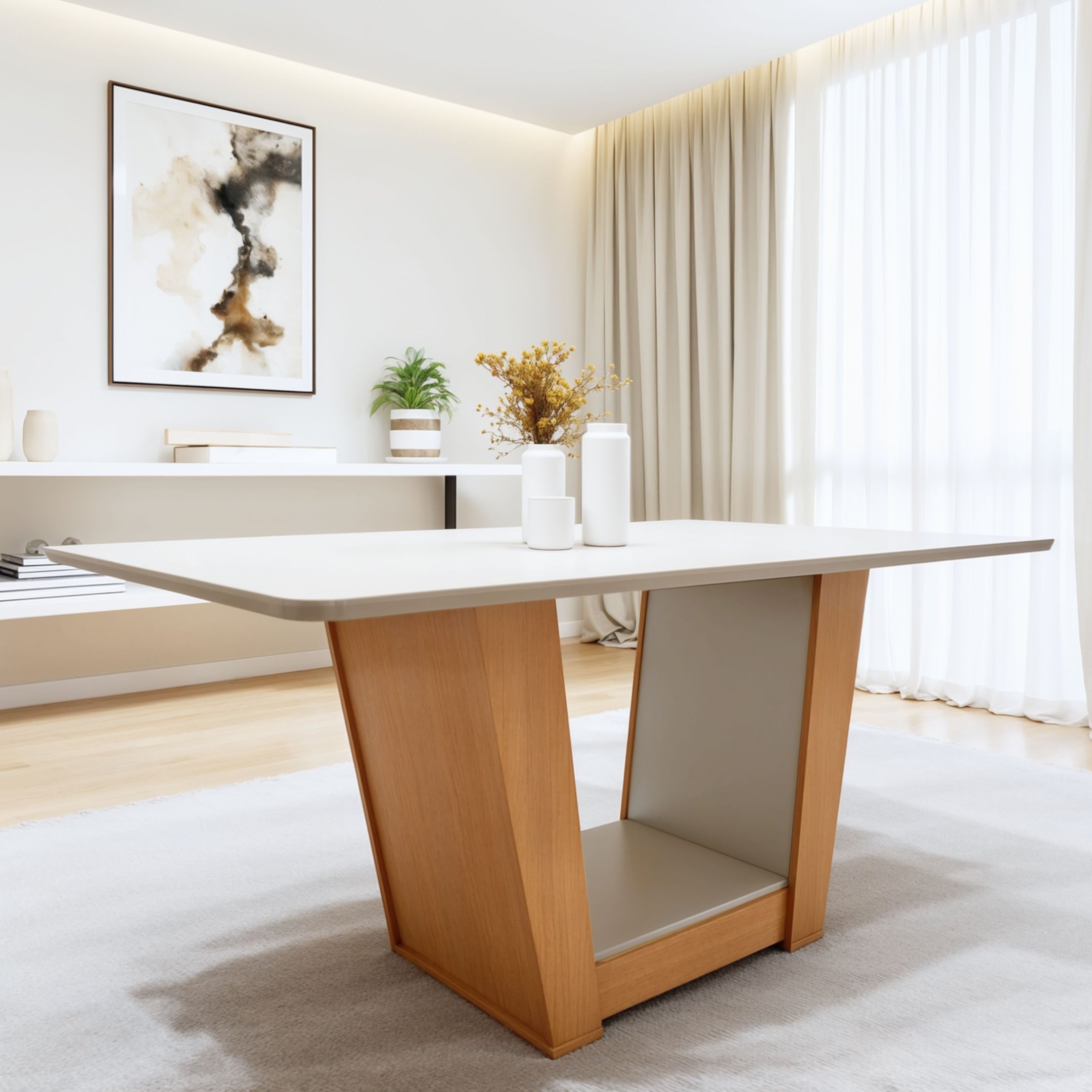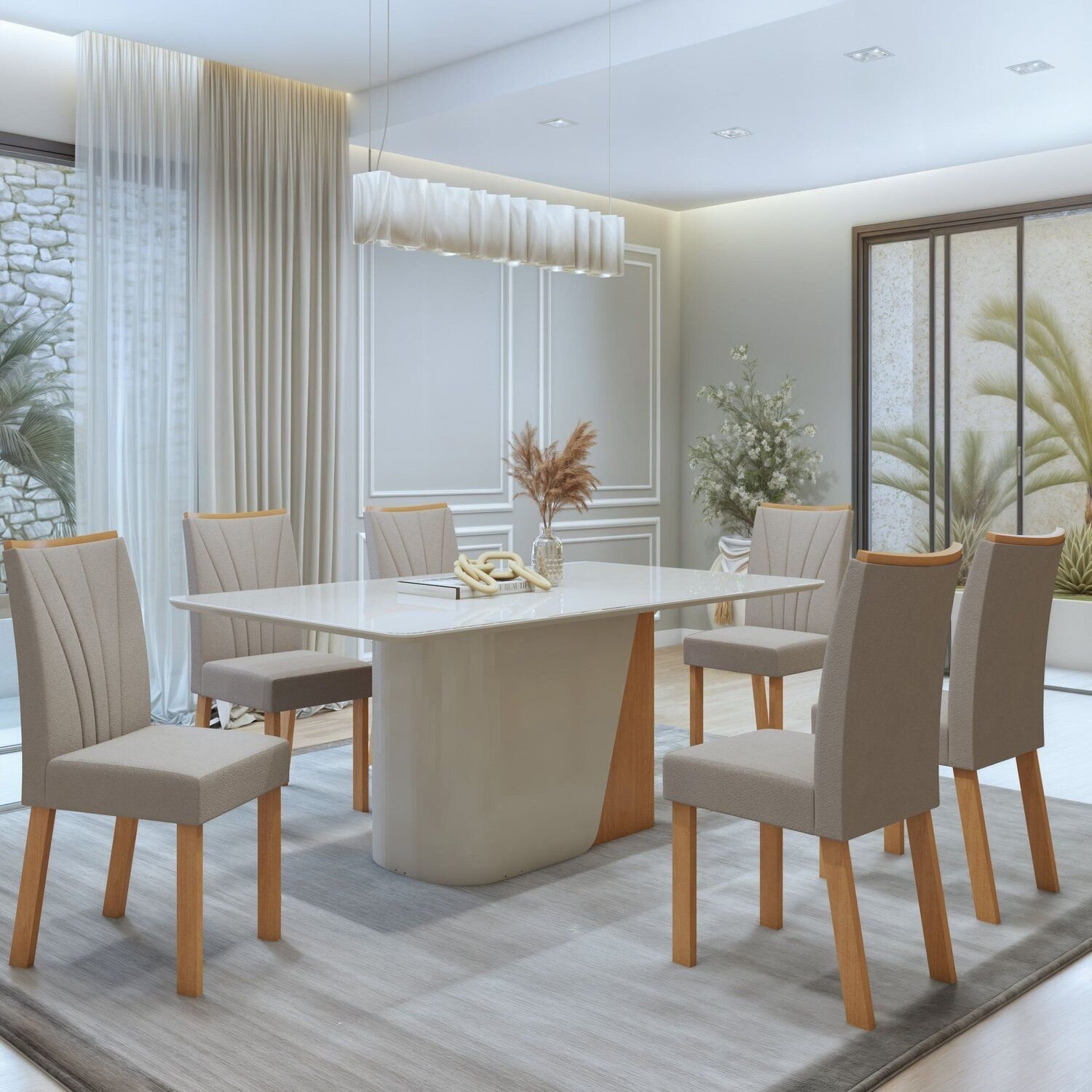 Mesa de Jantar Pérola 6 Lugares Mdf Off White Tampo Vidro Retangular Design Sofisticado