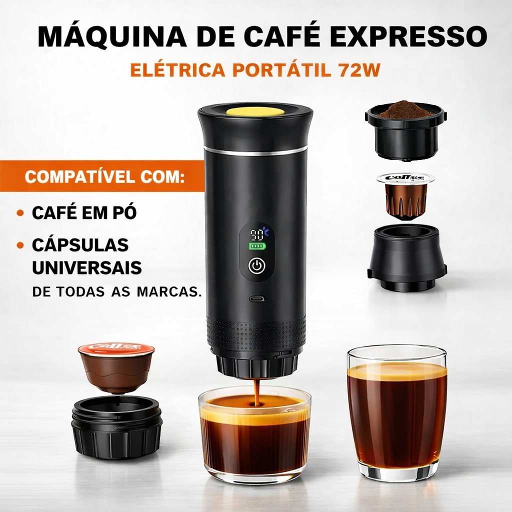 Cafeteira Expresso Portátil 3 em 1 Sem Fio Compatível Cápsula e Pó elétrica Carro 127v/220v Preta