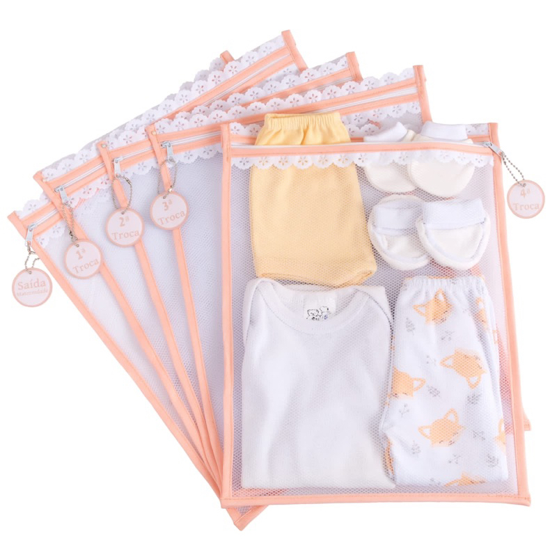 Kit c/ 5 Saquinhos Maternidade Organizadores para Bolsa Maternidade em TULE SUPER GROSSO + TAGS EM ACRÍLICO ( SALMÃO)