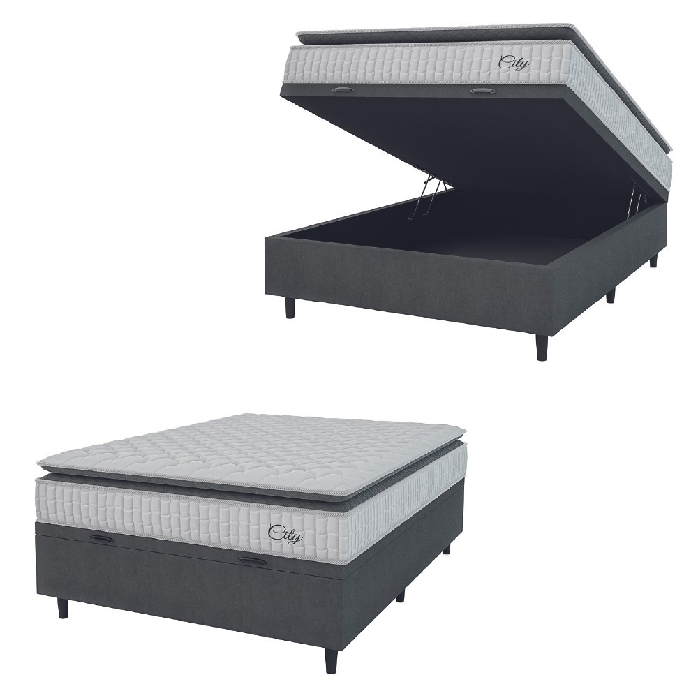 Cama Box Baú Colchão Casal Molas Ensacadas City Pillow Top 138x188x64cm Branco / Cinza Hellen - Suporta até 110kg por Pessoa
