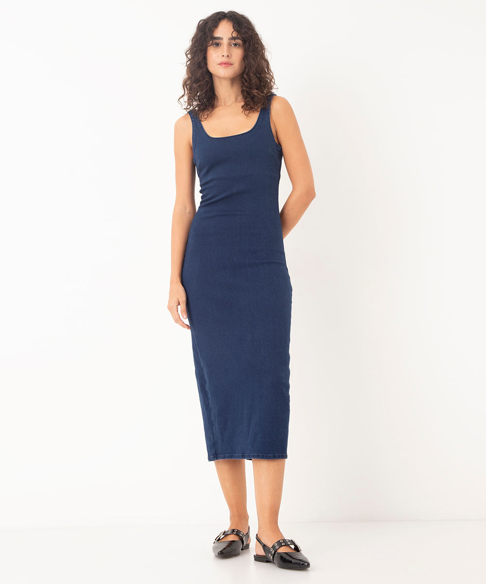 vestido jeans midi com fenda azul