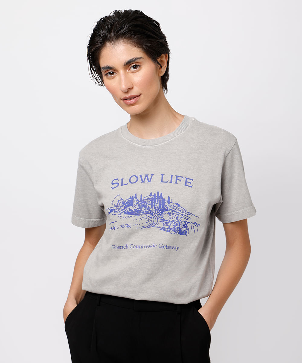 camiseta feminina de algodão slow life mindset cinza