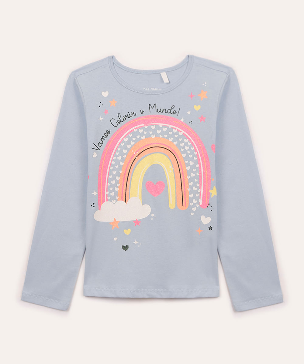 blusa de algodão infantil canelada arco íris manga longa rosa flúor