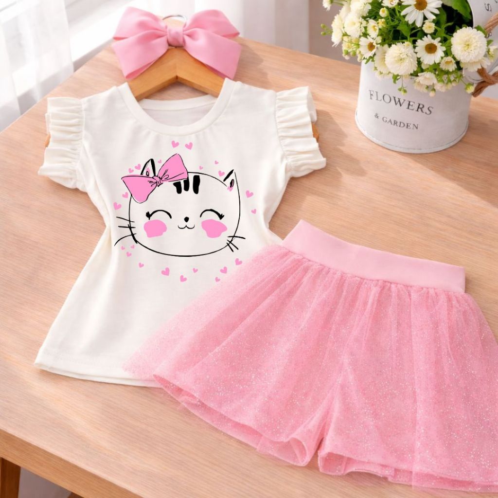 Conjunto Infantil Menina Delicado – Blusa Off White Estampa Gatinha Cute com Laço + Short Saia Tule Glitter Rosa Bebê