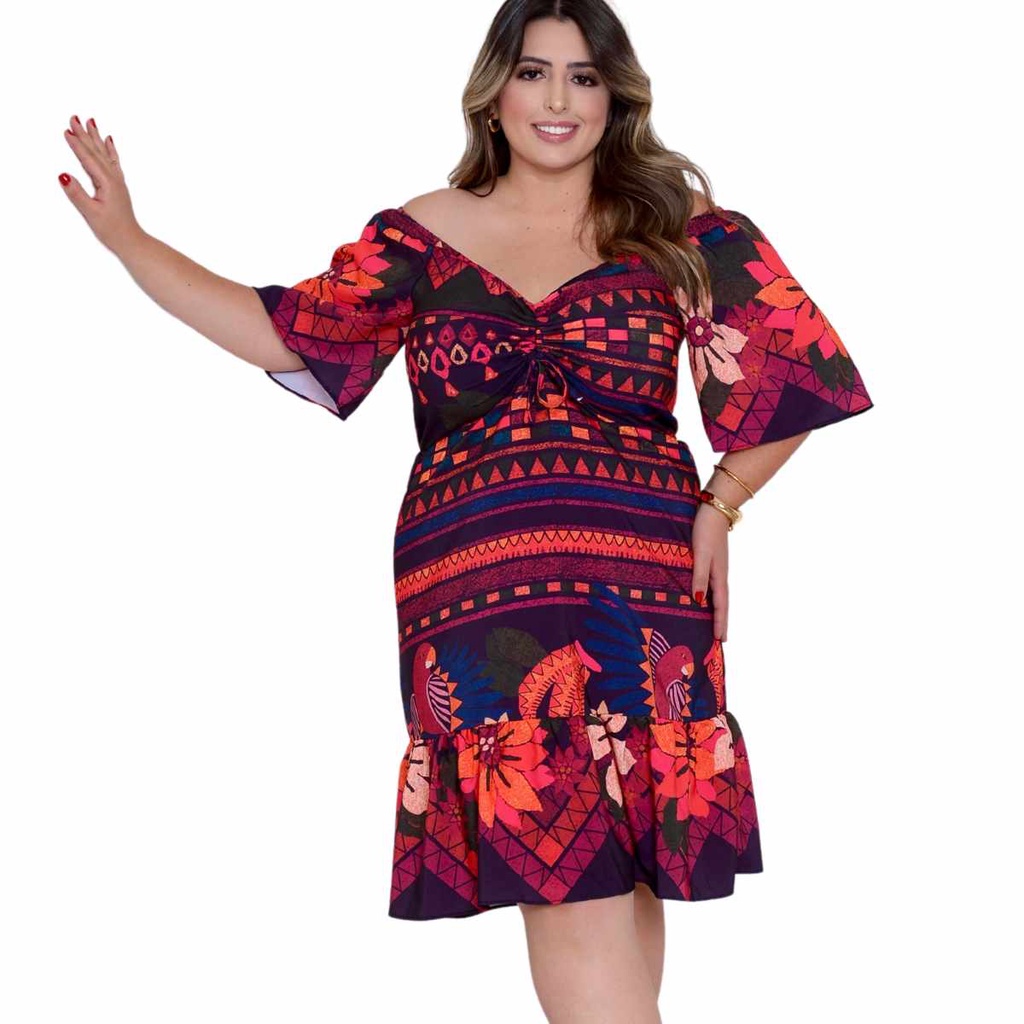 Vestido Midi Estampado Curto Plus Size Inspiração Farm