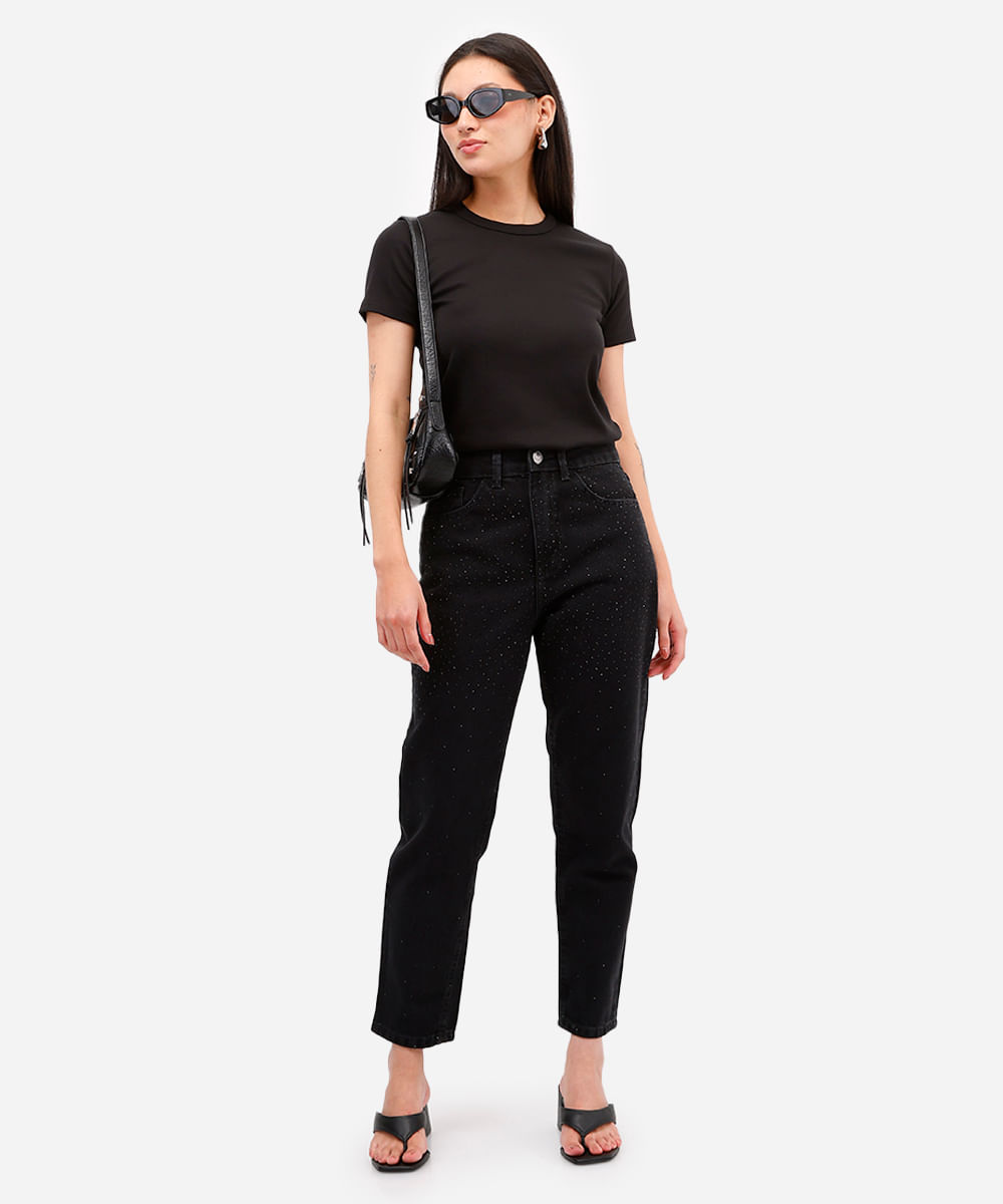 calça mom feminina jeans com brilhos preta