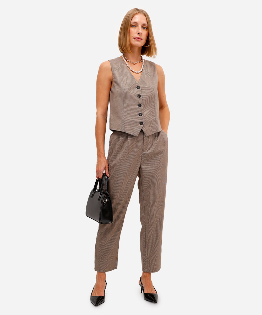 calça feminina de alfaiataria xadrez cós elástico bege