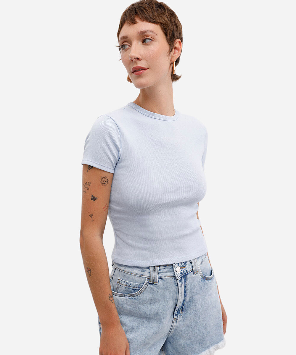 blusa feminina de algodão canelada manga curta azul
