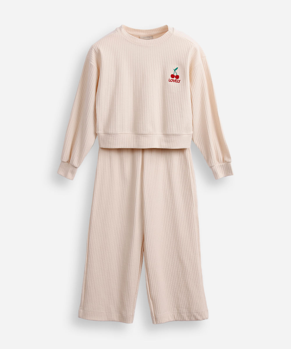 conjunto infantil longo de viscose canelado bege