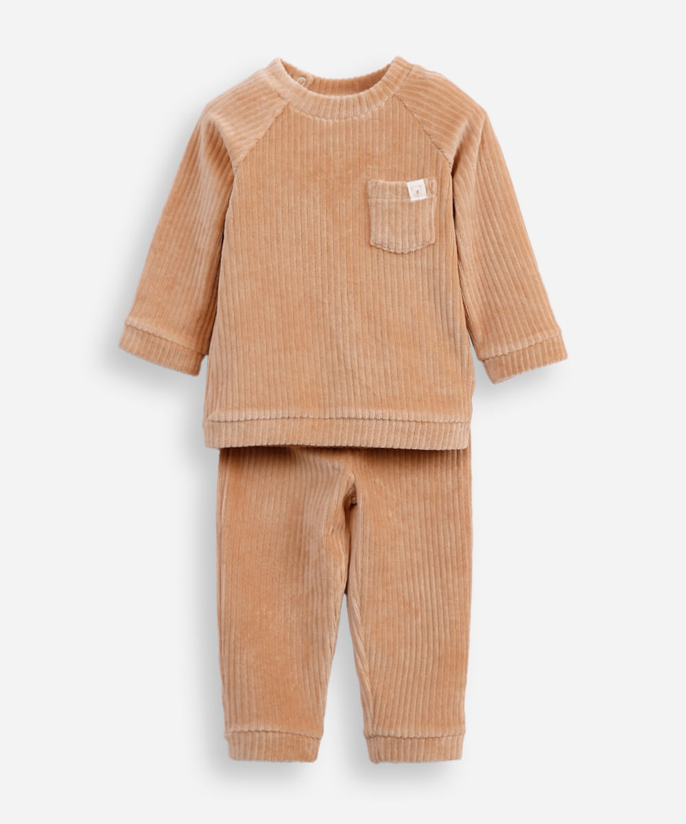 conjunto infantil longo de plush texturizado bege