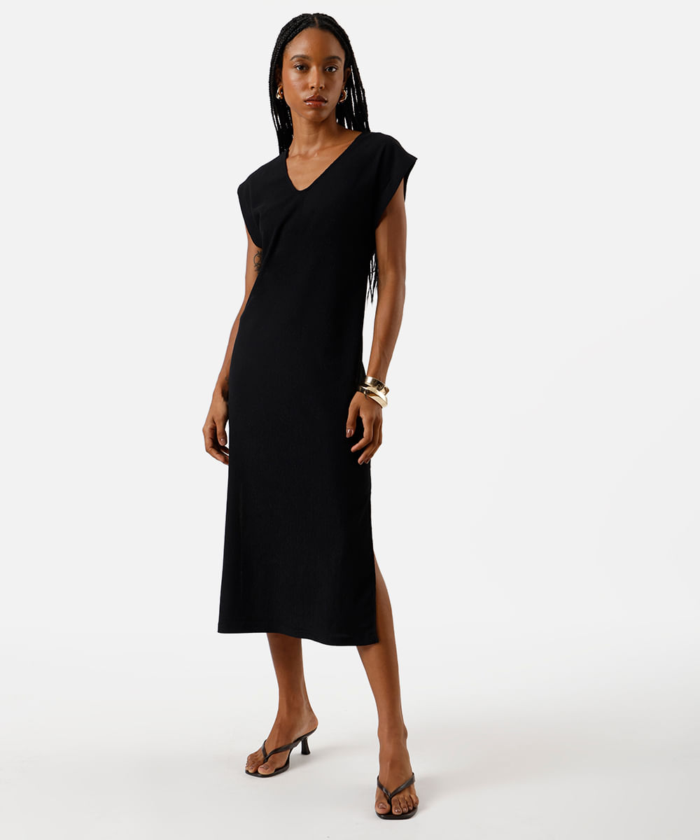 vestido midi muscle feminino com fendas texturizado básico preto
