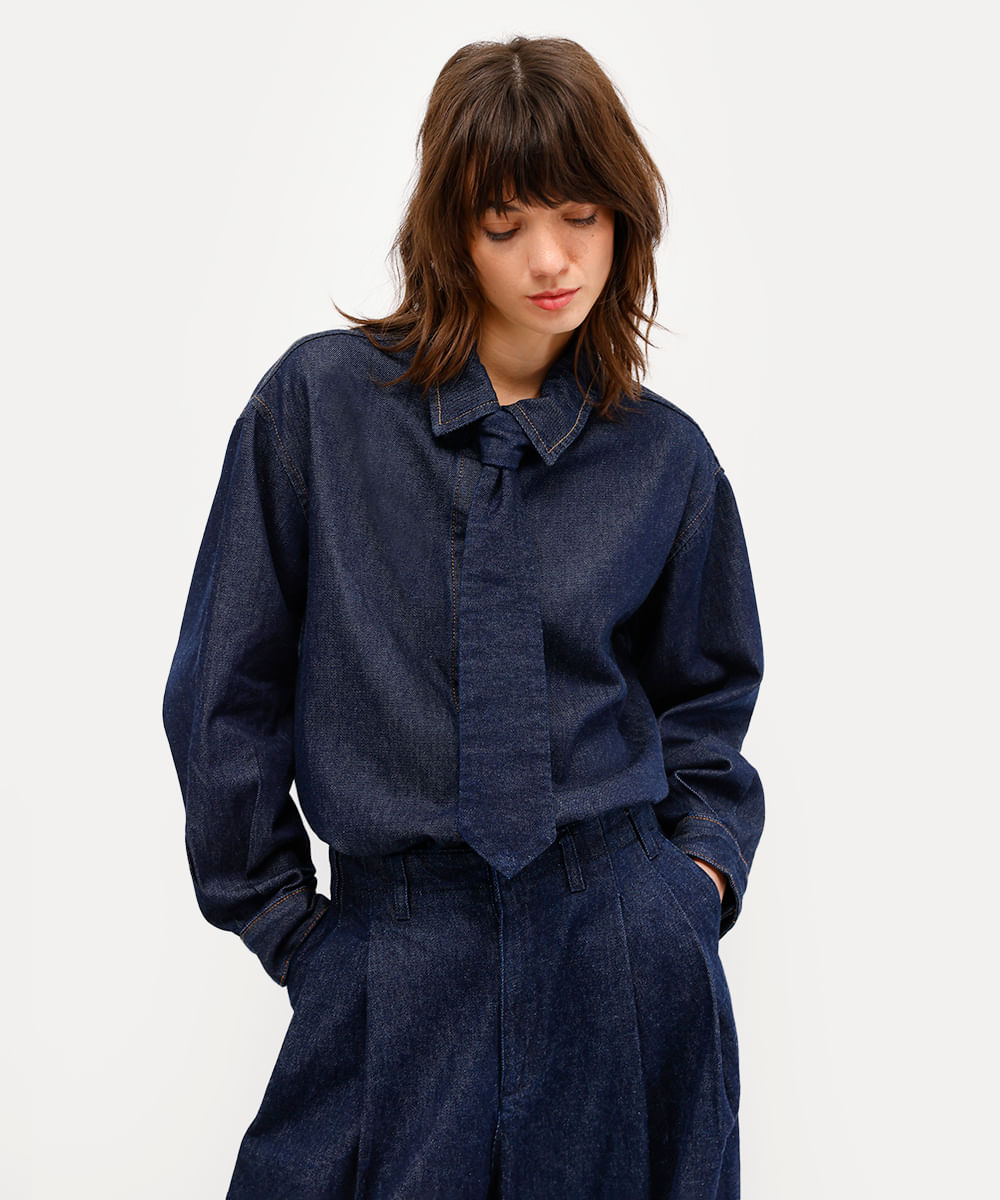 camisa feminina jeans manga longa azul