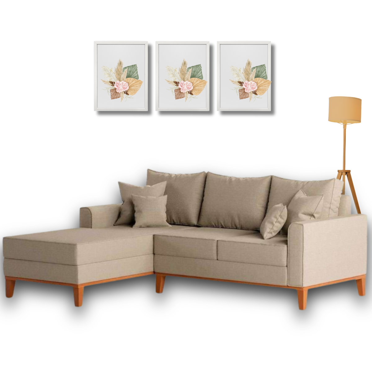 Sofá Beny com Chaise Esquerda, 3 Lugares, Estofado em Linho, Base em Madeira, 1,40x2,00m (bege)