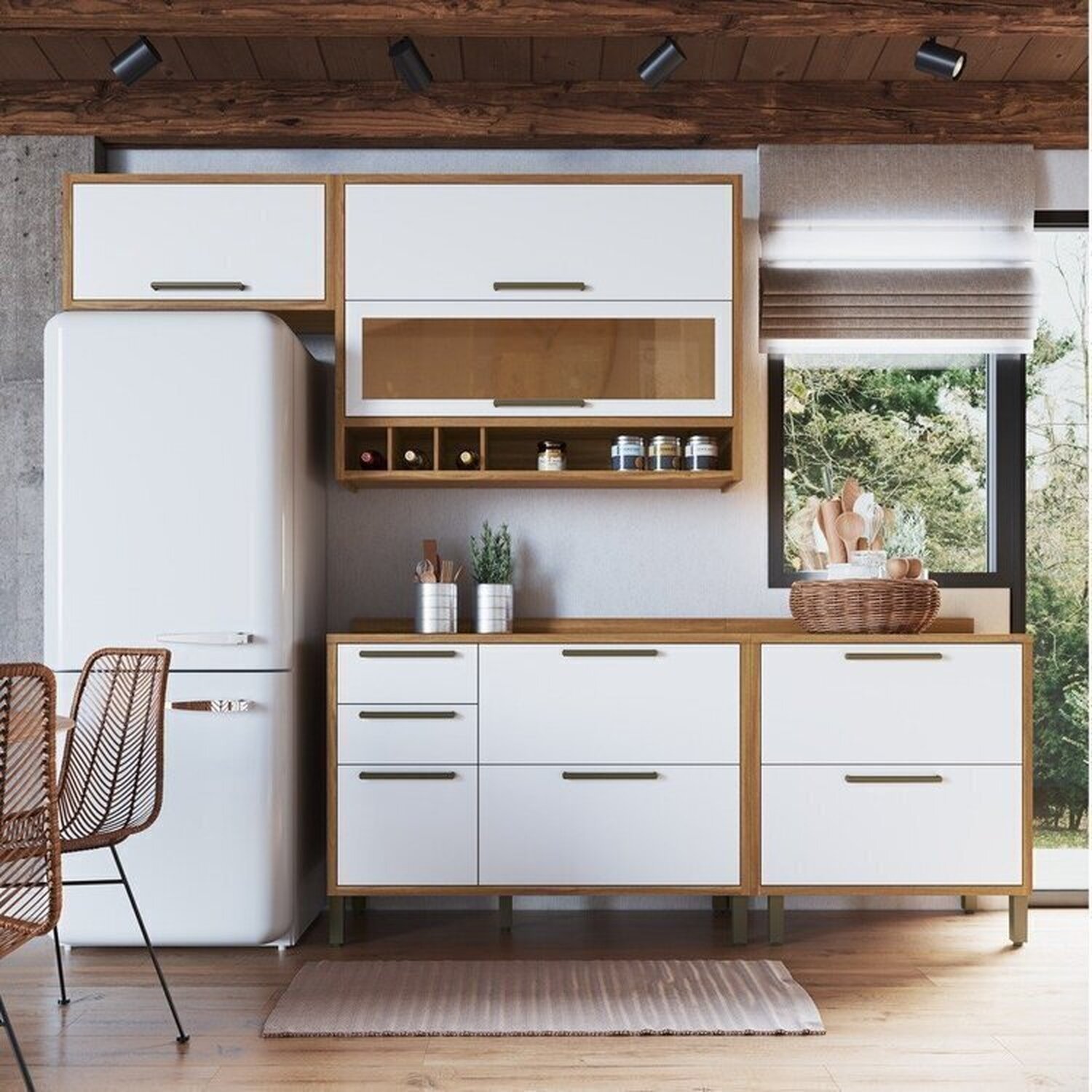Cozinha Compacta 194cm com 3 Peças Vidro Reflecta e torre quente 100% MDF Vicenza Espresso Móveis Amêndoa/Branco - Branco