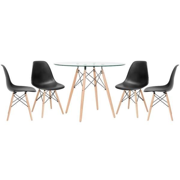 Conjunto Mesa Eiffel de Vidro com a Base Madeira 90cm + 4 Cadeiras Eames Dsw Preta