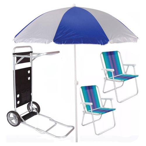 Kit Praia 4 Pçs Guarda Sol + Carrinho Vira Mesa E 2 Cadeiras