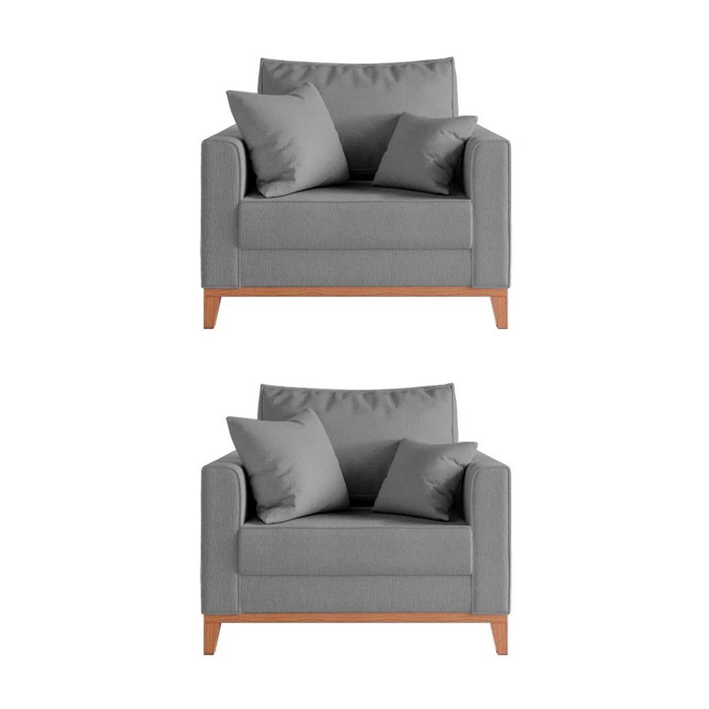 Kit 2 Poltronas Beny Decorativa com 2 Almofadas Linho Cinza Base em Madeira Maciça