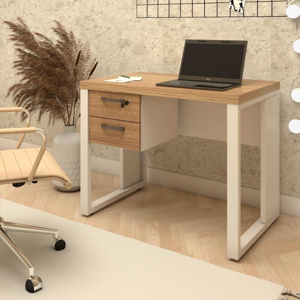 Escrivaninha Industrial com 2 Gavetas e Pés em Metal 90cm Cor:macadâmia com Branco