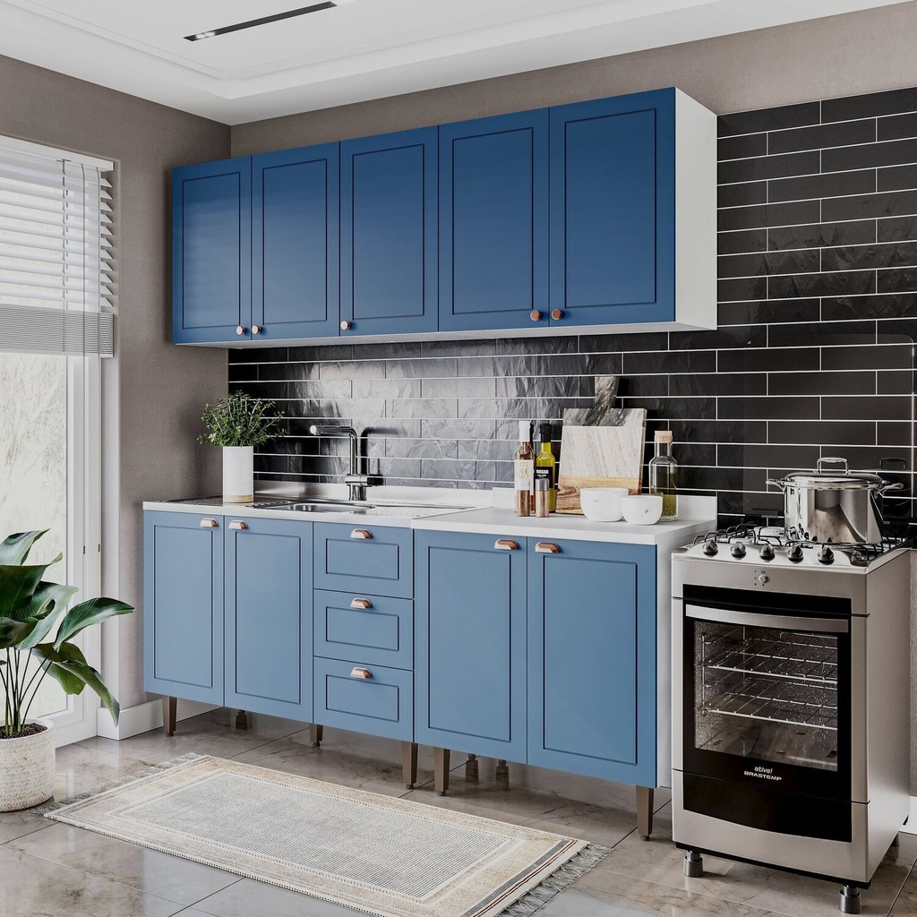 Cozinha Pérola com Rodapé 4 Peças Aéreos com 5 Portas, Balcão 2 Gavetas 3 Portas e Balcão 2 Portas Y Branco/Azul