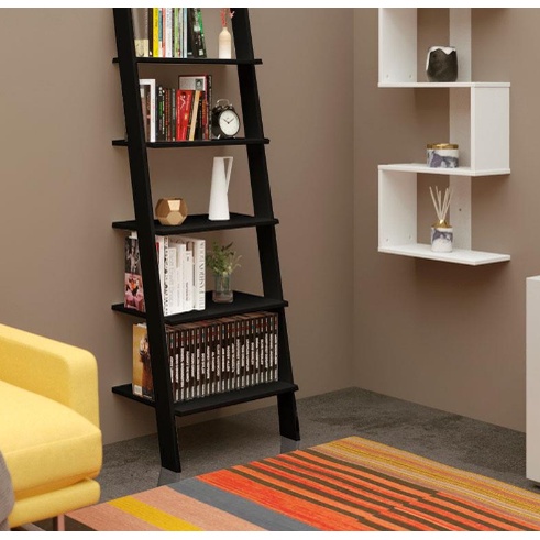 Estante escada preta com 5 ou 4 prateleiras de madeira pinus