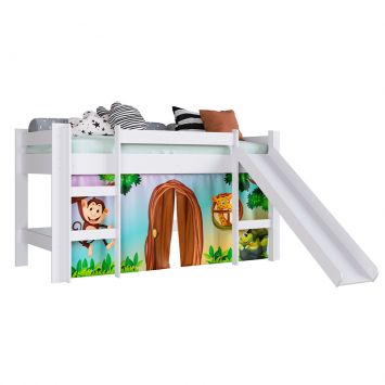Cama Infantil Elevada com Escorregador Branco com Cortina Estampada Zoo