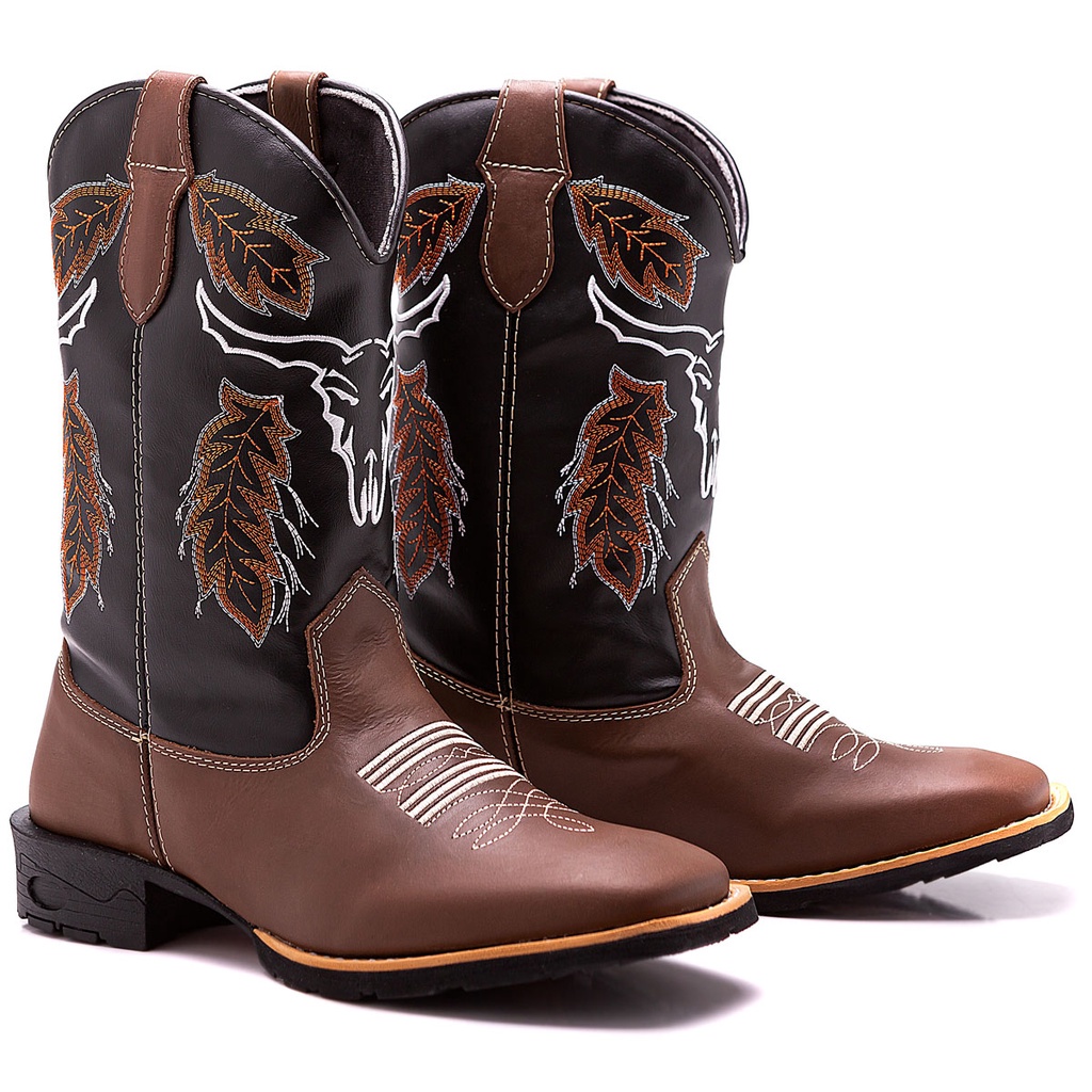 Bota Botina Texana Masculina Cowboy Montaria Botina Country de Couro Legítimo Bordada Cara de Boi