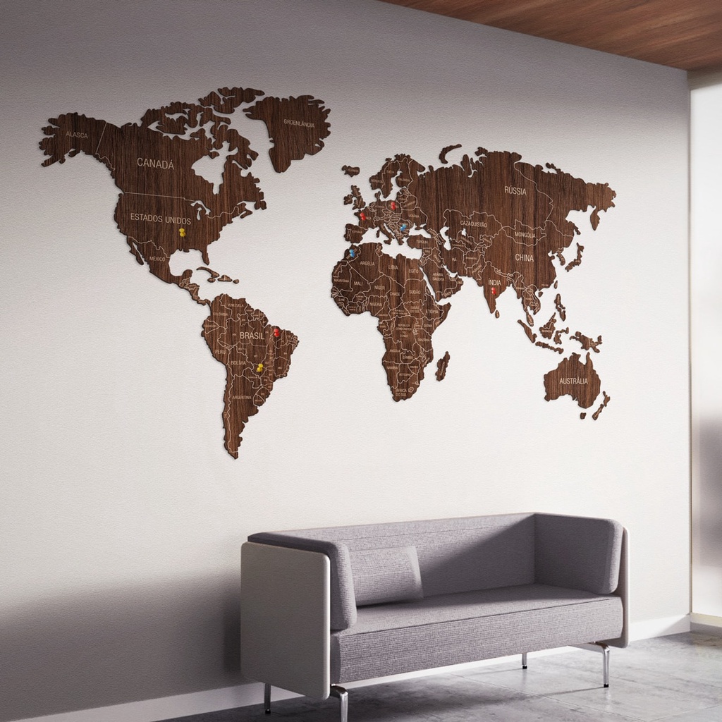 Mapa-múndi de madeira - Mapa de viagens - MDF 3mm com impressão UV - Com nomes de países - Acompanha PINS