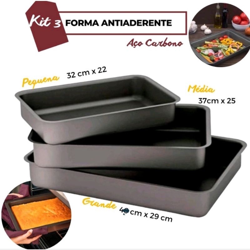 KIT 3 Formas Assadeiras Retangular Grande Antiaderente 42,37,32 – Aço Carbono de Alta Qualidade