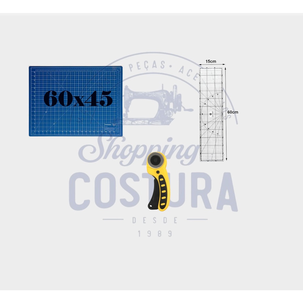 kit para patchwork base de corte 60x45, cortador 45mm e regua de acrilico 15x60