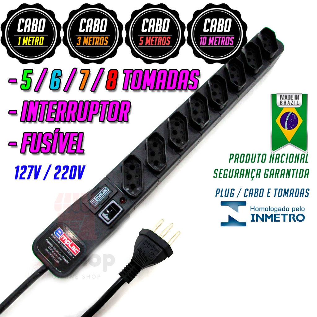 Filtro de Linha 5 6 7 e 8 Tom. Cabo 1mt 3mt 5mt 10mt Regua de Tomadas Premium