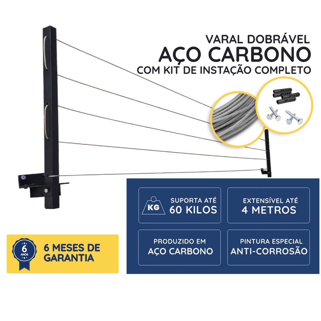 Varal De Roupa 60Kg Retrátil Parede Muro Apartamento Casa Até 4mt Reforçado com Kit Instalação