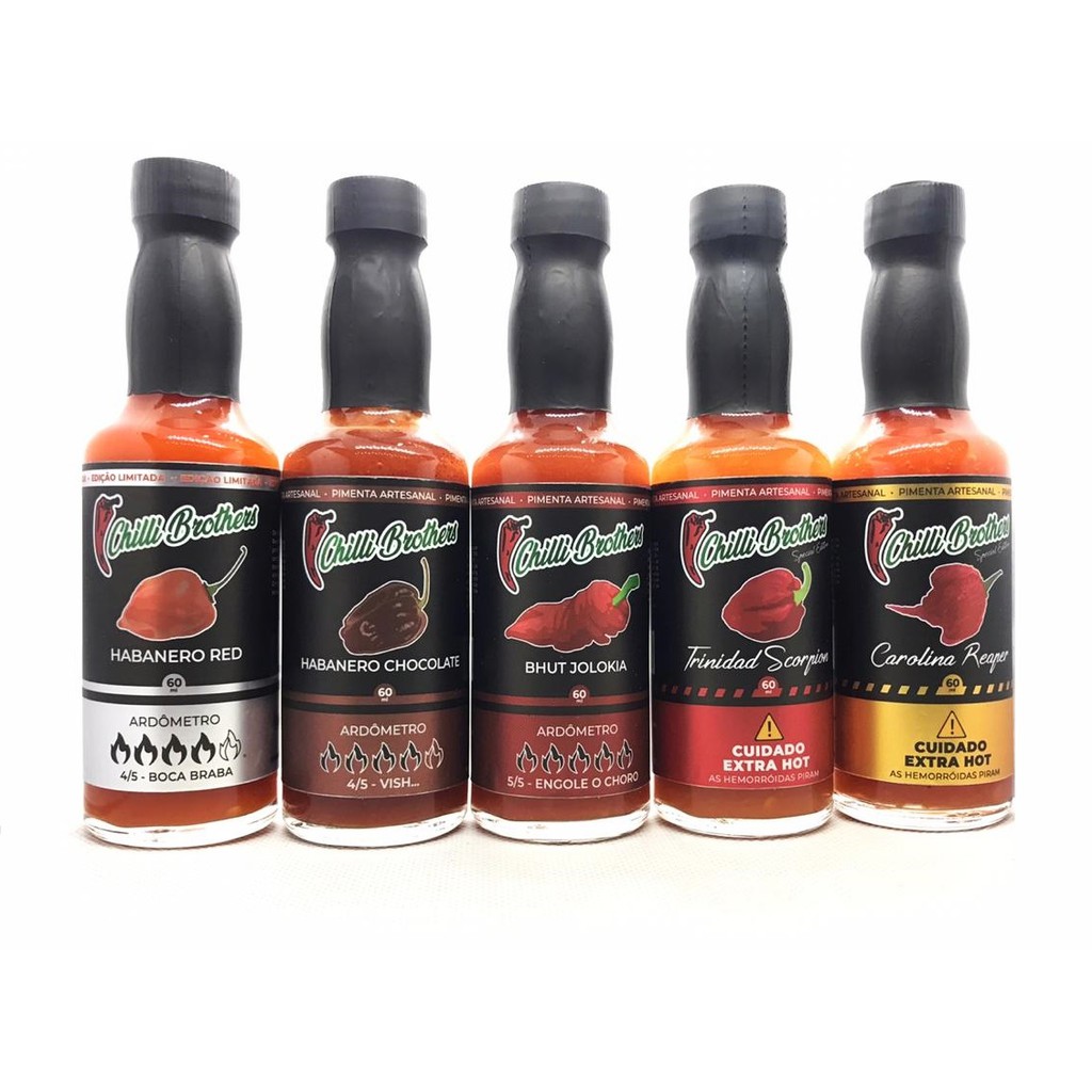 5 Molho De Pimenta 60ml Carolina Reaper, Scorpion, Bhut Jolokia, Habanero chocolate e habanero red Chilli Brothers