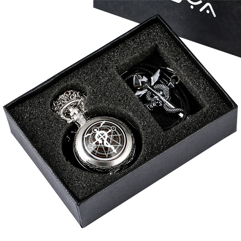 Silver Fullmetal Alchemis Japan Anime Men Women Analog Quartz Pocket Watch Necklace Chain Present Set Box