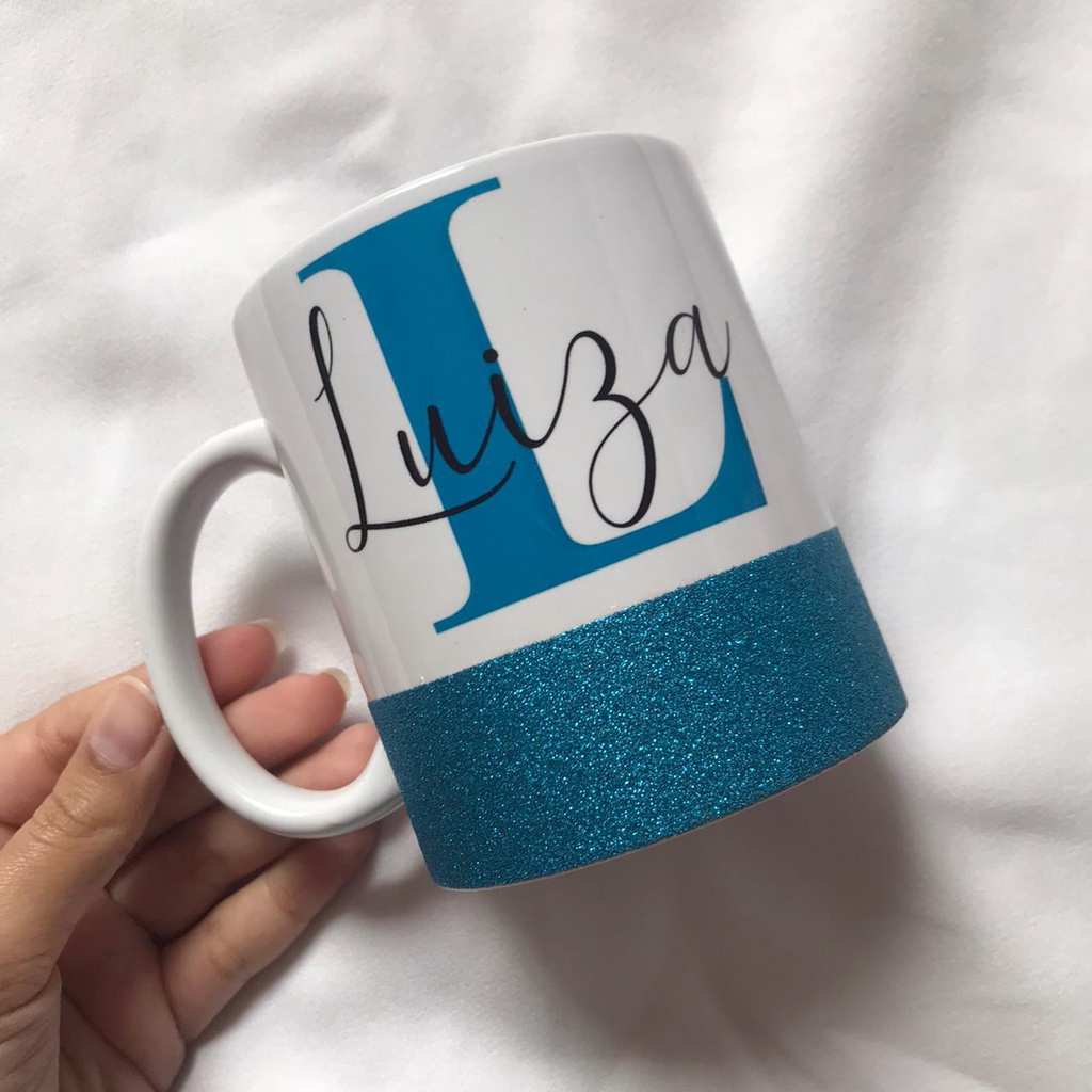 Caneca Com Base de Glitter Personalizada como Inicial e Nome + Frase, Desenho ou Signo no Verso.