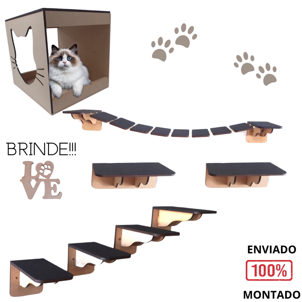 Playground para Gato 11 peças Circuito de Gatos combo Arranhador sisal + rede suspensa caminha nichos ponte degraus prateleiras MDF