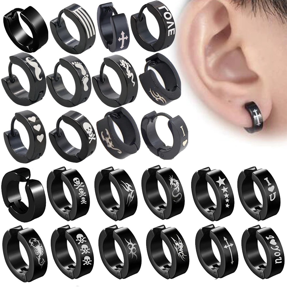 brinco de pressão masculino feminino em aço inox preto com desenho dragão caveira folha escorpião cruz estrela