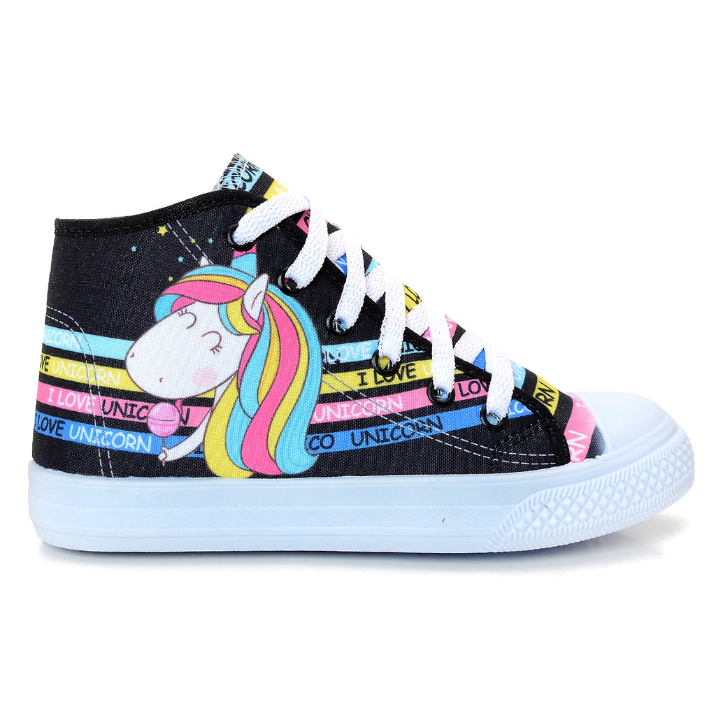 Tênis Infantil de Menina All Original Star Chic Feminino Personagem Unicórnio Arco Iris e Preto Brilhante Barato e Confortável