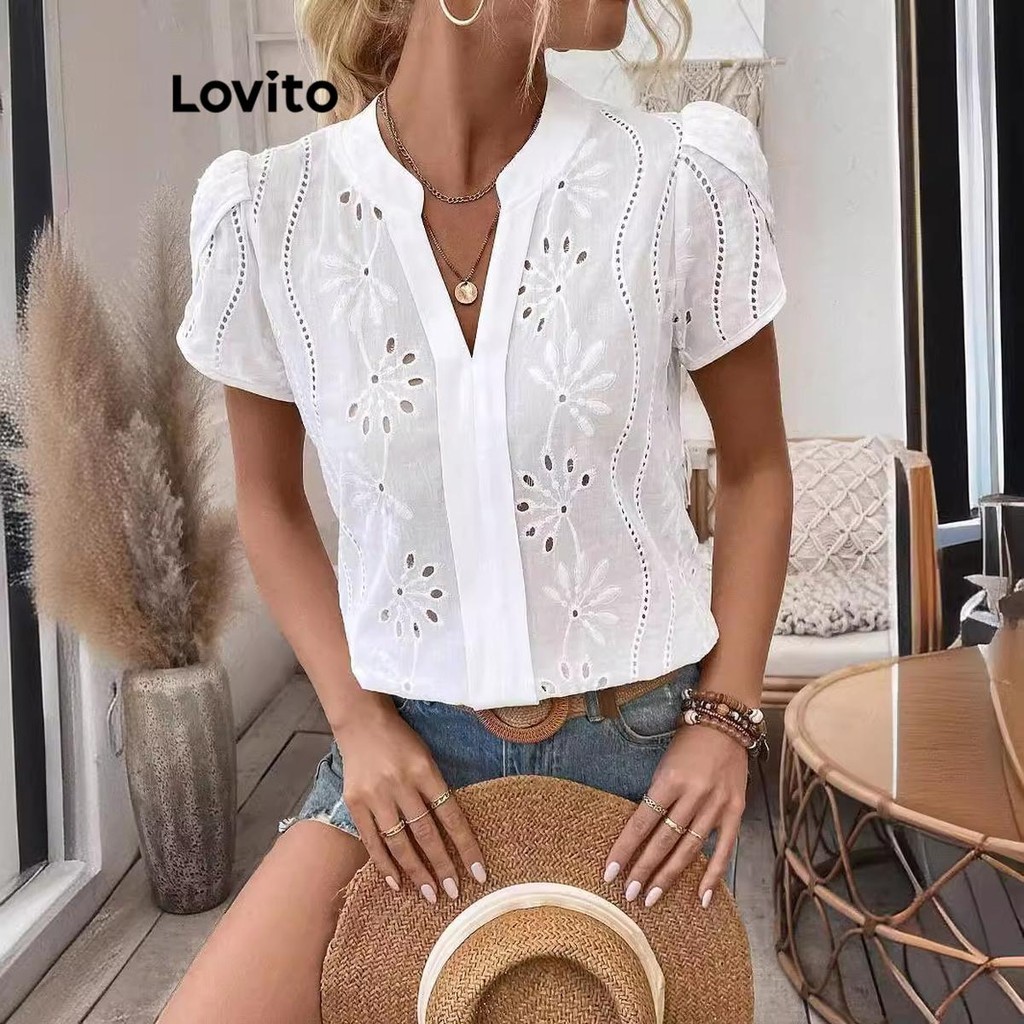 Lovito Blusa casual com bordado de ilhós liso para mulheres LNL73313