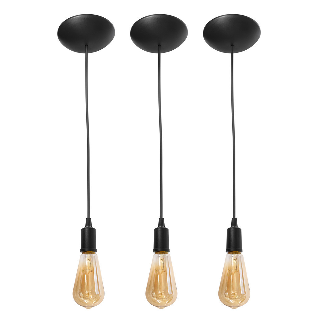 Kit 3 Pendente Lustre Luminarias Fio Simples Bocal Liso Cabo Retro Preto E-27 1 Metro Ajustável Com Canopla