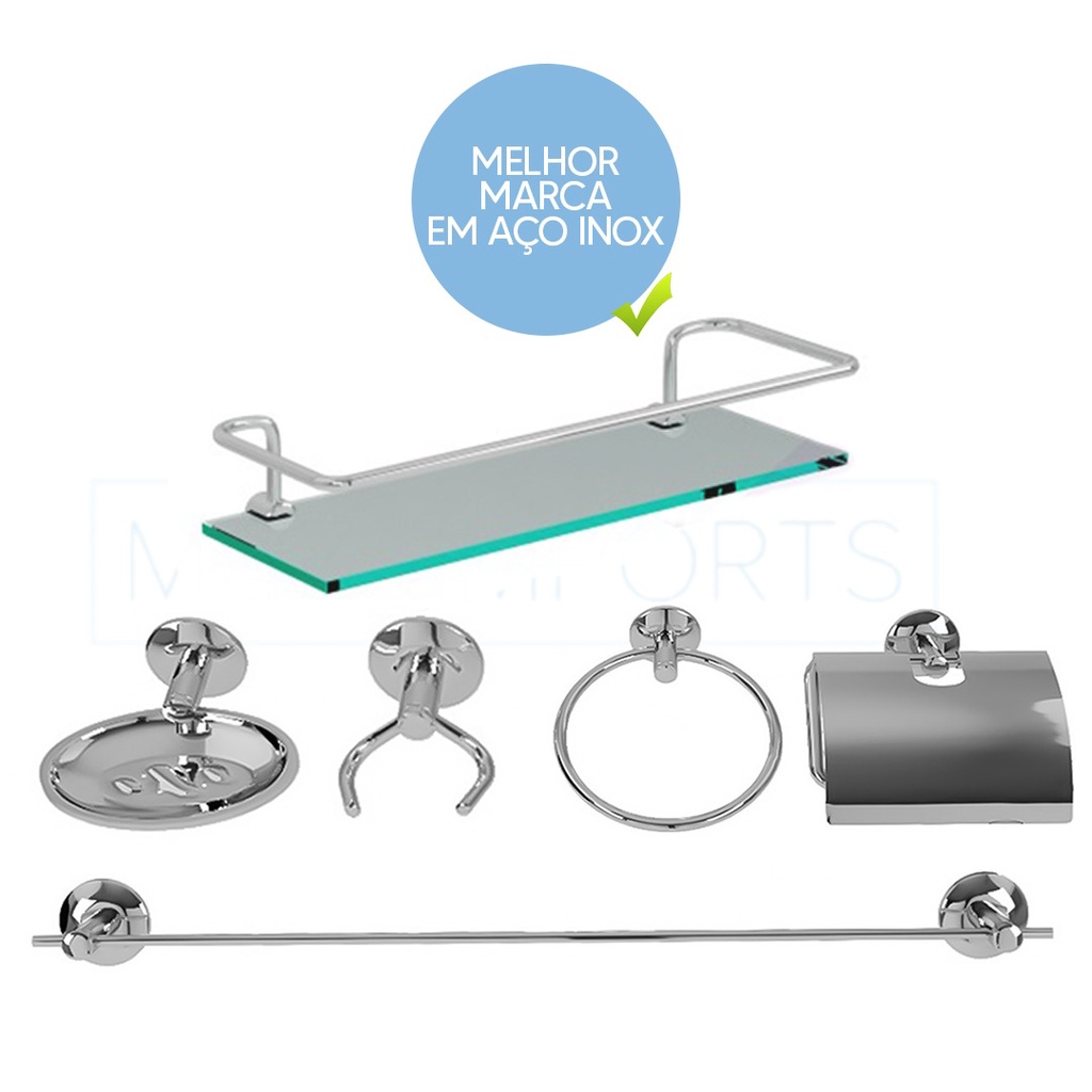 Kit banheiro Acessório Para banheiro lavabo Aço Inox 6 Peças Com Porta Shampoo Reto cod405