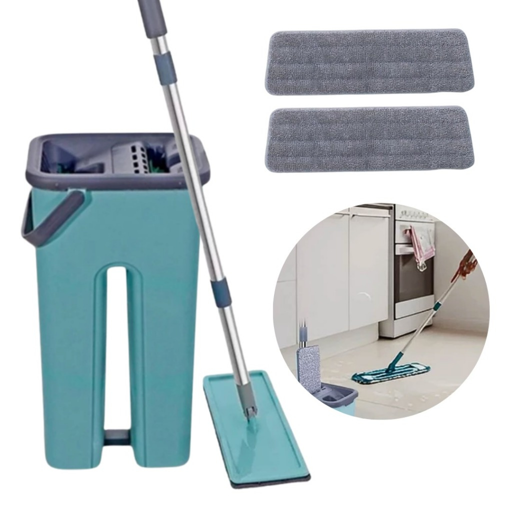 Flat Mop Rodo Magico 2 Refil Tira Sujeira Esfregão Vassoura Com Balde Lava Seca